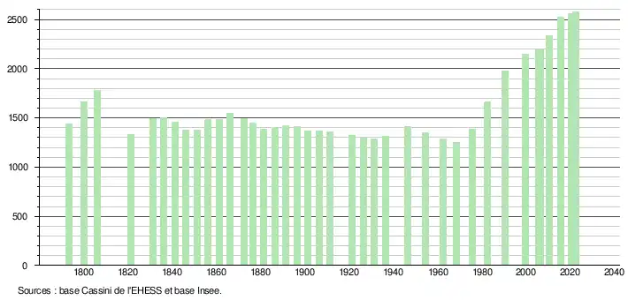 L'évolution du nombre d'habitants est connue à travers les recensements de la population effectués dans la commune depuis 1793. Pour les communes de moins de 10 000 habitants, une enquête de recensement portant sur toute la population est réalisée tous les cinq ans, les populations de référence des années intermédiaires étant quant à elles estimées par interpolation ou extrapolation[28]. Pour la commune, le premier recensement exhaustif entrant dans le cadre du nouveau dispositif a été réalisé en 2005[29].