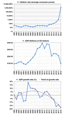 Le problème de l'hyperinflation commence en 2013[7]. Selon le FMI, l'inflation pourrait bondir à 10 000 000 % en 2019, après 1 370 000 en 2018[8] ; le PIB vénézuélien devrait se contracter de 12 % en 2017 après une chute de 18 % en 2016. Plus d’un million de Vénézuéliens ont fui leur pays pour se réfugier en Colombie, qui a un temps fermé sa frontière. D’autres ont choisi Manaus, au Brésil, pour sa commodité d’accès. Pas moins de 50 000 personnes sont parties chercher refuge au Chili[9].