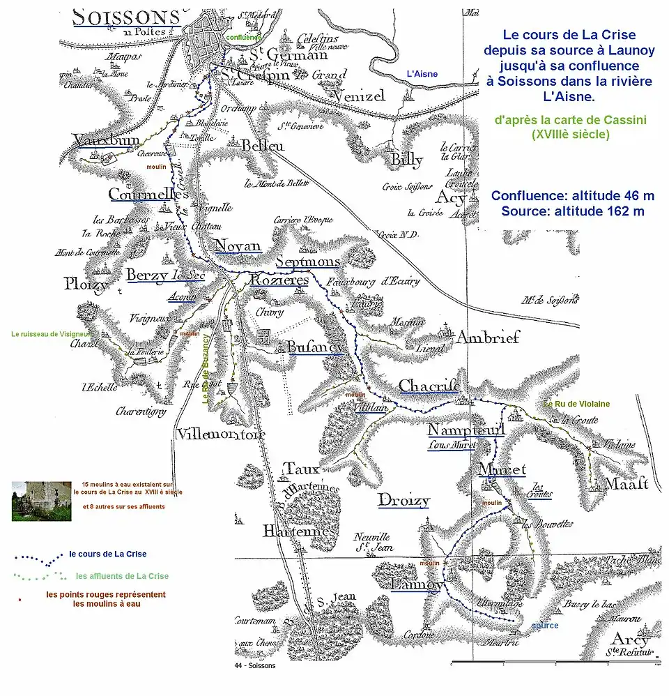 La Crise naît dans la petite localité de Launoy, dans le département de l'Aisne, à 162 mètres d'altitude, près du lieu-dit le Fond de Bucy. Après un parcours sinueux de près de 26 kilomètres[1], elle se jette dans l'Aisne, en rive gauche, sur le territoire de la ville de Soissons, à 46 mètres d'altitude. Elle coule globalement du sud vers le nord[4].