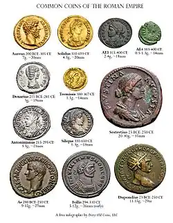Caracalla avait créé vers 215 une nouvelle pièce de monnaie, l’antoninianus, devant contenir 50% d’argent. Son titre baissera à 5% sous Gallien et à 1% sous Claude II[98],[99]. Cette dépréciation ne passa pas inaperçue dans la population et même les barbares exigeront dorénavant d’être payés en or ou en monnaie locale (Égypte). On continuait en effet à pouvoir acheter des monnaies d’or ou aurei à un taux fixe. Mais la dépréciation était telle qu’un marché noir se développa, l’or ayant une valeur réelle bien supérieure à sa valeur officielle[100]. Sous Auguste une livre d’or valait 1000 deniers; à la fin du IIIe siècle elle se situera dans une fourchette allant de 60 000 à 72 000 deniers[101]. Il en résultera une inflation qui portera la même mesure de blé qui valait 1 denier sous Auguste à 2 deniers en 200, puis à 4 en 250, à 6 en 269, à 50 en 276, à 75 au tournant du siècle[97] .