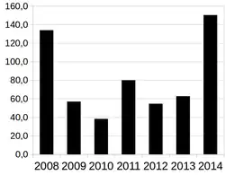 | Crise de Crimée | 18 mars 2014 | 415,46[36] | 0,7843[37] | 9 842,75[38] | 1,7242[39] | 182,34[40] | 54,4999[41] | 4,8001[42] | 10,0238[43] | 2 236,6599[44] | |||||||||