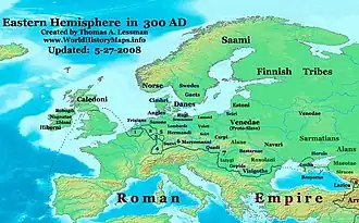 À cette même époque, les Huns dits « européens », profitant d’une crise analogue dans l’Empire chinois, fondent sur la mer Caspienne et la Russie méridionale, chassant devant eux les Alains, Goths, Vandales, Francs et autres peuples qui n’ont alors d’autre solution que de chercher refuge à l’intérieur des frontières de l’Empire romain. Encore simples peuplades au IIe siècle, ces tribus tendent à se coaliser et à former des confédérations ethniques au IIIe siècle comme les Alamans mentionnés pour la première fois en 213[24]. En Europe, les Francs menaceront le limes du Rhin, les Goths celui du Danube pendant que les Saxons envahiront la Grande-Bretagne. En Afrique, ce sont les Berbères qui pillent les possessions romaines de la côte méditerranéenne. Plus à l’est, les victoires romaines ont affaibli les Parthes qui sont bientôt supplantés par les Perses, lesquels voudront restaurer les frontières de l'antique Empire achéménide et s’avéreront des adversaires plus tenaces encore que leurs prédécesseurs[25].