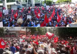 En haut : une manifestation anti coup d'État à Tunis, le .