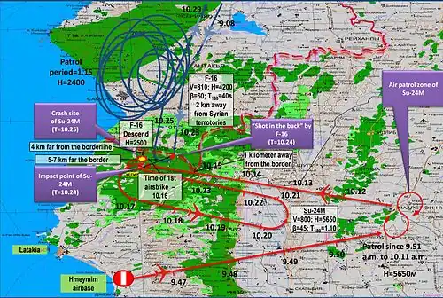 Les versions russe et turque des circonstances de cet incident divergent. Les faits en concordances sont les suivants. Le au matin, une paire de Su-24M de la 6980e base aérienne de la Garde de Shagol-Tcheliabinsk — sur les 24 en Syrie identifiés à l'époque — a décollé de la base aérienne de Hmeimim, située sur l'aéroport international de Lattaquié. Chacun d'eux était armé de 4 bombes à fragmentation OFAB-250-270 de 268 kg[167]. Ils prennent pour cible des positions de la « 1re division côtière », une formation de rebelles turkmènes ayant rejoint l'Armée syrienne libre[168] sur le djebel Zahiya au nord de Lattaquié et à cinq kilomètres de la frontière turque. Une paire de F-16C en patrouille du 182 Filo Atmaca (Escadron Faucon), venant de la base aérienne de Diyarbakır, abat ensuite l'ailier de la patrouille (code 19, no de série 0715323) à la frontière entre la Syrie et la Turquie par le tir au-delà de la portée visuelle d'un missile air-air AIM-120 AMRAAM[76].