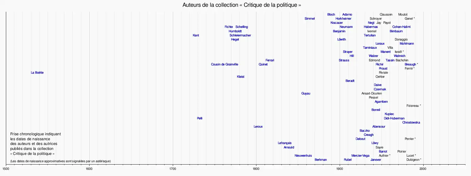 Louis JanoverMaximilien RubelAlexandre BerkmanLouis Mercier-VegaFerdinand Domela NieuwenhuisGilles DauvéArthur ArnouldMichael LöwyGustave LefrançaisSimone Debout-OleszkiewiczRonald CreaghBronisław BaczkoMiguel AbensourPierre LerouxSylwia D. ChrostowskaGeorges Didi-HubermanGiuseppe Bencivenni PelliAnne KupiecJean BorreilGiorgio AgambenJean-Marie GuyauMarcel CzermakJean DaiveCharlotte BeradtHeinrich von KleistÉtienne de La BoétieFrançoise ProustMartin BreaughMarc RichirEdgar QuinetJean-Baptiste Cousin de GrainvilleÉtienne TassinLeo StraussGiuseppe FerrariSophie WahnichMichael WalzerChristopher Hill (historien)Pierre ManentJoseph StrayerJacques TaminiauxGéraldine MuhlmannNicole LorauxKarl LöwithGeorg Wilhelm Friedrich HegelNicolas TertulianFriedrich SchleiermacherEmmanuel KantAntonia BirnbaumWalter BenjaminWilhelm von HumboldtMichèle Cohen-HalimiJürgen HabermasFranz Leopold NeumannFriedrich Wilhelm Joseph von SchellingJohann Gottlieb FichteOskar NegtSiegfried KracauerMax HorkheimerGeorg SimmelTheodor W. AdornoErnst Bloch