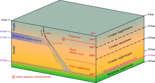 Par rapport aux déformations géologiques, la zone supérieure est plus fragile, et la zone sous-jacente plus ductile. Dans la zone ductile, la croûte terrestre peut se déformer plastiquement, c'est-à-dire sans se rompre et de façon permanente. À une profondeur d'environ 10 à 20 km, la pression et la température sont en effet si élevées que les principaux composants minéraux de la croûte, du quartz et du feldspath ne réagissent plus en cassant lorsqu'ils sont soumis à des contraintes tectoniques, mais réagissent de manière ductiles, par glissement aux limites des cristaux ou en recristallisant. La profondeur de cette zone de transition dépend du flux de chaleur et de la teneur en fluide de la croûte terrestre. Dans les régions magmatiquement actives avec un flux de chaleur accru et une concentration de fluide plus élevée, la zone ductile commence à une profondeur plus faible, ce qui rend la croûte terrestre plus facilement déformable.