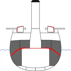Pour engager un véritable combat d'artillerie, une protection est aménagée à l'intérieur du navire, sous le pont, autour de la machinerie. Il est armé d'une douzaine de canons de calibre 100 à 152 mm. L'augmentation progressive du blindage et de l'artillerie lourde augmente le poids de déplacement, rendant le navire moins manœuvrable.