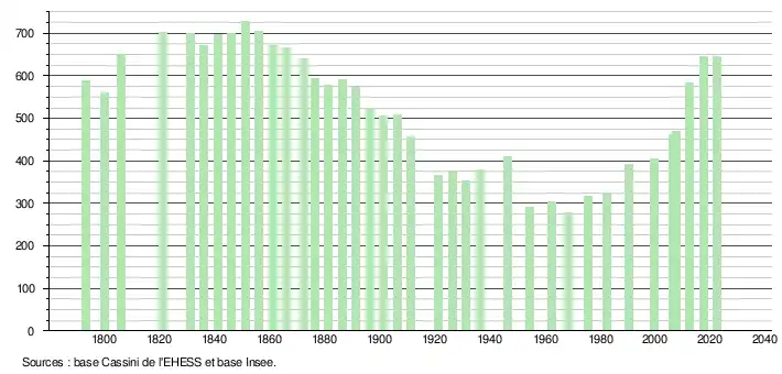 L'évolution du nombre d'habitants est connue à travers les recensements de la population effectués dans la commune depuis 1793. Pour les communes de moins de 10 000 habitants, une enquête de recensement portant sur toute la population est réalisée tous les cinq ans, les populations de référence des années intermédiaires étant quant à elles estimées par interpolation ou extrapolation[30]. Pour la commune, le premier recensement exhaustif entrant dans le cadre du nouveau dispositif a été réalisé en 2007[31].