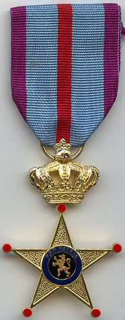 La médaille est une étoile dorée avec une perle rouge à chaque branche. L'étoile est suspendue au ruban par une couronne royale et un anneau. L'avers de la médaille montre un lion dorée sur un fond noir entourée d'un cercle bleu avec la devise Pro Patria. Le revers montre une couronne de lauriers entourant 2 épées croisées.