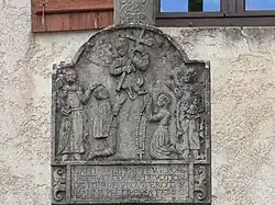 Une plaque de pierre est fixée à la colonne, dans sa section inférieure. Elle comprend un bas-relief daté de 1592[1] et une inscription relative à l'érection du monument. L'inscription est la suivante : « L'AN 1592 LE 9 MAY FUT POSEZ / CESTE CROIX À LA DEVOTION / DE PIERRE FROUTEROT & / JEANNE PHELIPEZ SA FEMME ». Le relief montre les deux commanditaires en adoration devant un ange, chacun suivi de son saint patron. L'envers présente les instruments de la Passion.