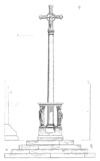 Elle est formée d'une croix en pierre au sommet d'une colonne, plantée sur une plate-forme supportée par quatre statues, et posée sur un gradin en pierre.