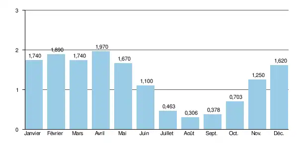Aux étiages, le VCN3 peut chuter jusque 0,046 m3/s (quarante-six litres/s), en cas de période quinquennale sèche[2], ce qui n'est pas excessivement sévère pour un cours d'eau de cette taille.