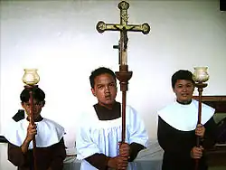 Le cruciféraire, appelé aussi porte-croix, est le servant d'autel qui porte la croix de procession avec le crucifix tourné vers l'avant.