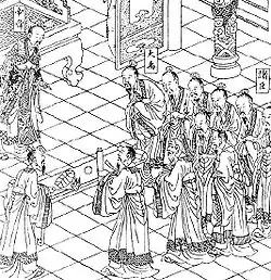 Vers la fin de l'année, Shun revient au siège impérial et, après avoir offert un taureau en sacrifice au temple de ses ancêtres, met en œuvre le plan qu'il a élaboré au cours de sa tournée d'inspection[19]. L'une de ces mesures consiste à diviser l'empire en douze unités administratives (zhou), chacune administrée depuis la plus haute montagne de la région[19]. Il s'agit sans aucun doute d'un expédient utile face à la montée et à l'imprévisibilité des eaux de la crue. Une autre des mesures prises par Shun est la réforme administrative.