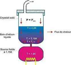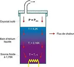 Le moyen le plus simple pour obtenir un bain d'hélium superfluide est de remplir un réservoir d'hélium liquide à 4,2 K, puis d'abaisser progressivement la pression au-dessus du bain en pompant dessus (voir figure 4).