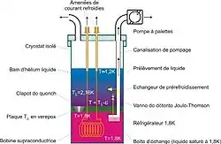 La figure 8 illustre également comment obtenir une source froide à 1,8 K pour refroidir le bain. De l'hélium liquide (à 4,2 K) est prélevé dans le bain principal, à la pression atmosphérique. En faisant subir à ce liquide une détente isenthalpique (dite de Joule-Thomson), on va abaisser sa température, au prix de l'évaporation d'une fraction de cet hélium. La température de l'hélium après détente est fixée par la basse pression que la pompe est capable de maintenir au bas de la canalisation de pompage. Le rendement de la détente peut être grandement amélioré si l'on pré-refroidit l'hélium liquide prélevé à 4,2 K en le faisant passer dans un échangeur traversé par les vapeurs froides pompées. La détente a lieu dans une vanne Joule-Thomson réglable permettant d'ajuster le débit. En traversant la vanne, l'hélium liquide se refroidit et se vaporise partiellement. C'est la fraction évaporée qui fournit les frigories servant à refroidir le liquide restant. Ce mélange diphasique est amené dans une boîte d'échange située au pied de la canalisation de pompage. La fraction évaporée est avalée par la pompe via la canalisation de pompage. Le liquide refroidi à 1,8 K coule au fond de la boîte et sert de source froide pour le bain qui l'entoure (bain de la bobine). En absorbant de la chaleur du bain, le liquide de la boîte est évaporé et évacué vers la pompe.