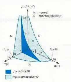 La figure 1 illustre ainsi les limitations du domaine supraconducteur pour le cas du niobium-titane.
