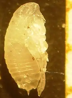Les larves grandissent grâce à des mues. Les dépouilles qu’elles abandonnent à cette occasion sont les exuvies. La larve L1 mue en donnant une larve L2 qui est suivie elle-même d’une larve L3. L1, L2 et L3 ont la même forme générale. L3 atteint une taille d’environ 5 mm. Grâce à leurs pièces buccales broyeuses, les larves se nourrissent des excréments solides des adultes. Le tube digestif est de ce fait coloré en rouge plus ou moins foncé. À la fin du stade L3, la larve cesse de s’alimenter, thorax et abdomen prennent alors une couleur blanche. À 15−20 °C, l’ensemble des 3 stades larvaires dure environ 15 jours.