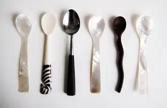 - Cuillère à caviar de très petite contenance et jamais en métal (sauf l'or et l'argent) car il altère le goût du caviar, mais en nacre, en os, en ivoire, en corne, en cristal, en verre... C'est souvent un objet de luxe. les plus anciennes remontent au XVIIe siècle ;
