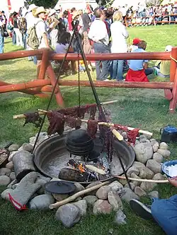 - Barbecue à la texane : depuis près de 200 ans, l'État du Texas est célèbre pour l'élevage de bétail et les cow-boys[11]. Un héritage culinaire important dans cet État, comme dans la majorité du Sud-Ouest, est donc la préférence pour le bœuf ou autres viandes mais jamais pour le porc au barbecue. Chaque partie de l'État, plus grand que la France entière, a ses préférences : par exemple, tout près de la frontière avec le Mexique, les habitants préfèrent le cabrito, un chevreau entier rôti à la broche[12]. Dans le centre du Texas, le bœuf pur, toujours pur, est généralement frotté uniquement avec du sel et du poivre noir (bien que certains restaurants soient connus pour utiliser d'autres épices), puis cuit à la chaleur indirecte du bois de noix de pécan, de chêne ou de mesquite. La sauce est généralement considérée comme inutile, mais elle peut être servie en accompagnement pour compléter la viande. Les saucisses épicées sont toujours au rendez-vous, ainsi que la bière très froide.