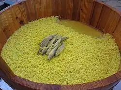 L'un des plats les plus populaires est la tiella, un plat mijoté avec du riz, des pommes de terre et des moules[20]. Cette version est originaire de Bari, mais il existe de nombreuses variations locales provenant de Foggia, Tarente et du Salento. Certaines d'entre elles n'incluent même pas les fruits de mer[40].