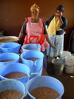 - Mielies ou mealies, l'un des aliments de base, correspondant à l'ugali ou le Mieliepap une purée de maïs avec viande en sauce