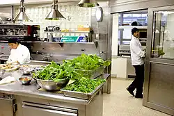 Généralement, dans les restaurants de bonne taille où l'on fait la totalité de la confection du plat et qui ont un local cuisine important, la nourriture y est préparée par un chef cuisinier et ses cuisiniers.