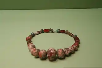 | Coupe en terre cuite peinte en vert et jaune et pendentif en bronze en forme d'oiseau | collier en agate | Perle d'agate du Xe ou IXe siècle av. J.-C. de la tombe de Khodjaly, avec inscription cunéiforme du nom du roi assyrien Adad-nerari II (911 - ) : Palais d'Adad-nerari, tsar de l'univers. |