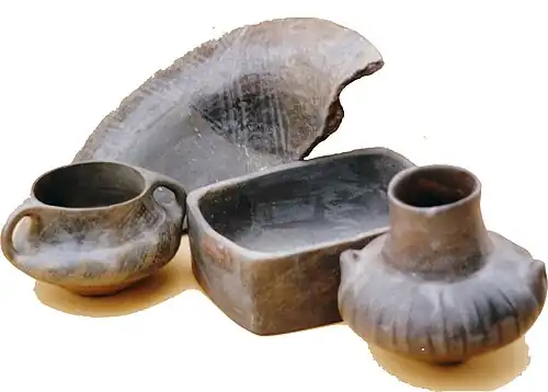 Trois sortes de poterie furent produites au long des quatre périodes. Les premières ont des parois fines et des couleurs légères, dues à la cuisson, et des grains de mica. Les deuxièmes sont grossières et sans ornements et les troisièmes, plus rares, sont elles aussi frustes avec de larges parois, mais elles sont faites de terre mêlées à des paillettes ou des petits galets. Pendant les phases I et III, le rouge prédomine, tandis que pendant la phase IV les poteries sont grises et noires. Celles de la phase II sont caractérisées par des couleurs grises et marron ainsi que par des ornements en nervure. Les pots de la phase I sont souvent décorés de peinture blanche, qui forme des bandes, des triangles et des végétaux.