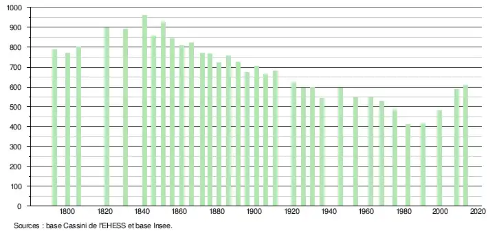 L'évolution du nombre d'habitants est connue à travers les recensements de la population effectués dans la commune depuis 1793. À partir du , les populations légales des communes sont publiées annuellement dans le cadre d'un recensement qui repose désormais sur une collecte d'information annuelle, concernant successivement tous les territoires communaux au cours d'une période de cinq ans. Pour les communes de moins de 10 000 habitants, une enquête de recensement portant sur toute la population est réalisée tous les cinq ans, les populations légales des années intermédiaires étant quant à elles estimées par interpolation ou extrapolation[34]. Pour la commune, le premier recensement exhaustif entrant dans le cadre du nouveau dispositif a été réalisé en 2008[35],[Note 1].