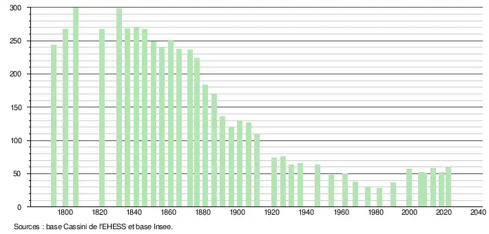 L'évolution du nombre d'habitants est connue à travers les recensements de la population effectués dans la commune depuis 1793. Pour les communes de moins de 10 000 habitants, une enquête de recensement portant sur toute la population est réalisée tous les cinq ans, les populations de référence des années intermédiaires étant quant à elles estimées par interpolation ou extrapolation[52]. Pour la commune, le premier recensement exhaustif entrant dans le cadre du nouveau dispositif a été réalisé en 2008[53].