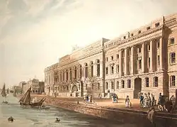 La façade nord du nouveau bâtiment de Laing était simple, mais le front sud vers la rivière avait des ailes avec des colonnades ioniques et une partie centrale en saillie. L'étage mansardé de ce dernier était décoré de figures en terre cuite en bas-relief par John Charles Felix Rossi et JG Bubb [4] représentant les arts et les sciences, le commerce et l'industrie, et les habitants de divers pays du monde. Un cadran d'horloge était soutenu par des personnages colossaux symbolisant l'Industrie et l'Abondance, et les armes royales par des figures de l'Océan et du Commerce. La façade le long du fleuve faisait 148 mètres de long [5] et le bâtiment a coûté 255 000 £ [6].