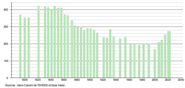 L'évolution du nombre d'habitants est connue à travers les recensements de la population effectués dans la commune depuis 1793. Pour les communes de moins de 10 000 habitants, une enquête de recensement portant sur toute la population est réalisée tous les cinq ans, les populations de référence des années intermédiaires étant quant à elles estimées par interpolation ou extrapolation[16]. Pour la commune, le premier recensement exhaustif entrant dans le cadre du nouveau dispositif a été réalisé en 2005[17].