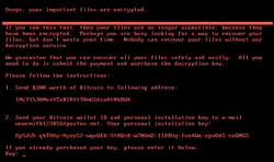 « Ooops, vos fichiers ont été chiffrés. Si vous voyez ce message, vos fichiers ne sont plus accessibles, car ils ont été chiffrés. Peut-être que vous recherchez un moyen de récupérer vos fichiers, mais ne perdez pas votre temps. Personne ne peut récupérer vos fichiers sans notre service de déchiffrement. »