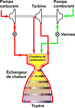 Le cycle à expandeur est une configuration de moteur-fusée à ergols liquides dans laquelle la turbine de la turbopompe est alimentée par la détente de l'ergol cryotechnique qui circule dans les parois de la chambre de combustion et de la tuyère pour la refroidir et passe de l'état liquide à l'état gazeux[1]. Ce dispositif remplace le générateur de gaz séparé de la chambre de combustion utilisé pour alimenter la turbine dans un cycle générateur de gaz.