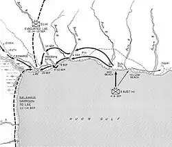 Les Alliés lancent ensuite une campagne de suivi sur la péninsule de Huon, avec un débarquement à Scarlet Beach par la 20e brigade d'infanterie[81]. Au même moment, le 22e bataillon d'infanterie, une unité de milice australienne est débarqué dans le cadre de la 4e brigade d'infanterie les 10/11 septembre pour relever les 2/13e et 2/15e bataillons d'infanterie autour de la tête de pont, afin de les libérer pour l'avancée vers l'ouest sur Lae[82], suivit les Japonais se repliant vers l'est, marchant de Hopoi Mission Station à Finschhafen, en vue de faire pression sur le flanc sud japonais[83]. Cet exploit est décrit par le Kalgoorlie Miner comme la « plus grande marche » de la campagne de Nouvelle-Guinée et en 10 jours, le bataillon parvient à couvrir 80 km de terrain accidenté[84].