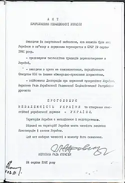 L'Acte de déclaration d'indépendance de l'Ukraine (en ukrainien Акт проголошення незалежності України, Akt proholochennia nezalejnosti Oukraïny) est l'acte d'indépendance adopté par le Soviet suprême de la RSS d'Ukraine (en) le et rétablissant l'indépendance de l'État ukrainien[1],[2].