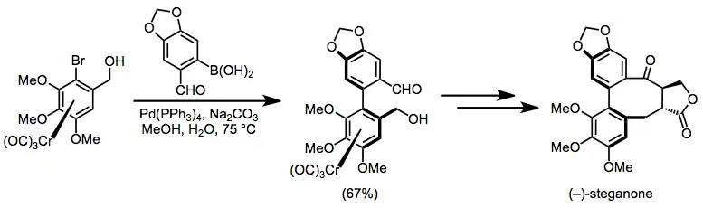 Le complexe (C5H5N)3Cr(CO)3 peut alors être recyclé. L'exemple ci-dessous illustre cette approche pour produire la (–)-stéganone via un complexe de chrome et d'halogénure d'aryle, procédé terminé par une décomplexation libérant le produit final[2].