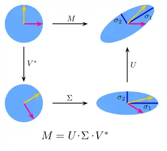 avec U une matrice unitaire m×m sur K, Σ une matrice m×n dont les coefficients diagonaux sont des réels positifs ou nuls et tous les autres sont nuls, et V* est la matrice adjointe à V, matrice unitaire n×n sur K. On appelle cette factorisation la décomposition en valeurs singulières de M.