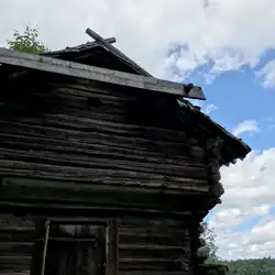 Par conséquent, la maison finno-suédoise vernaculaire la plus ancienne demeure pendant longtemps une cabane en rondins posés horizontalement. Il s’agit d’une maison-bloc sans cheminée pour les hommes et les bêtes qui n’est pas sans rappeler l’isba noire en Russie partie septentrionale[29]. Un foyer ouvert se trouve au centre de la pièce pour chauffer et cuisiner. Dépourvue de fenêtres, et encore moins de fenêtres vitrées, la fumée qui s’accumule dans la seule pièce habitable doit être évacuée par un orifice dans la paroi. Le toit est couvert d’écorces de bouleau, de tourbe ou de chevrons[28].