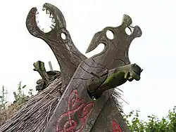 L’une des maisons typiques de l’époque viking est la maison longue dont celle du site de fouilles de la forteresse circulaire de Trelleborg près de Slagelse au Danemark sert de référence[19]. Elle est a été reconstituée pour mieux se représenter la forme du bateau qu’elle imite à maints égards, à commencer par le toit en coque de navire, la forme générale en fuseau et l’armature des poteaux tout autour. D’un point de vue ornemental, la comparaison entre maison et bateau se remarque avec la décoration du pignon avec les deux planches ou tasseaux de rive arrondis qui se croisent en forme de cornes[20]. Sur une autre maison de cet écomusée archéologique de Trelleborg, les figures ornementales d’un pignon d’une maison à toit de chaume attirent l’attention avec une tête de chien et une tête de serpent qui se croisent à l’instar des têtes de chevaux croisées des maisons bas-saxonnes en Allemagne. La photo ci-contre permet de mettre en évidence au moins deux aspects spécifiques de la sphère nordique : la première est le cumul des motifs ornementaux à l’extrême pointe du pignon avec les deux planches de rive zoomorphes, mais aussi la poutre faîtière saillante qui est décorée avec une figure également zoomorphe et enfin la sculpture sur bois peinte en rouge représentant des motifs qui ne peuvent pas encore être les rinceaux d’acanthe mais des figures païennes comme des serpents qui s’entrelacent.