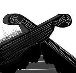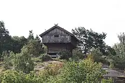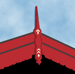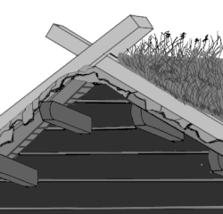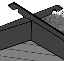 ![]() | ![]() | Décoration de pignon sur toiture végétale avec deux pièces de bois assemblées à mi-bois. Ce modèle était très répandu. Compte tenu du fait que les poutres ou chevrons n'ont aucune forme particulière, pas même schématisée, seul le motif du croisement des deux pièces sert d'ornementation à ce toit. |