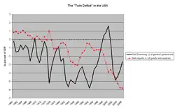 L’expression de « déficits jumeaux » est utilisée pour caractériser l’économie des États-Unis au début des années 1980, et au cours des années 2000. Les baisses d'impôts dans les années 1980 ont causé une augmentation de 3 points de PIB du déficit public entre 1980 et 1985 ; or, entre 1985 et 1986, le déficit commercial a lui-même augmenté de 3 points de PIB[1].