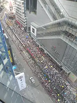 | 2019 | Non à l'amendement de la loi d'extradition vers la Chine, départ immédiat de Carrie Lam | 550 000[24] | 231 000 à 287 000[7] | 190 000[25] | En utilisant le big data, une équipe de Ming Pao, Cable News, l'Université de Hong Kong et l'Université du Texas estima que le taux de la participation était près de 265 000[25]. Reuters estima qu'il y avait 227 000 participants. Il s'agit du défilé annuel le plus peuplé car il fut une partie d'une série des manifestations contre la loi d'extradition en 2019. La fin de ce défilé était changé à Central, près du chemin Chater, à cause du conflit violent au conseil législatif[26] |