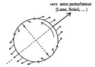 Les équipotentielles sont déformées en première approximation de manière à constituer des ellipsoïdes centrés sur le centre de masse de la Terre et allongés dans la direction de l'astre perturbateur. En négligeant pour le moment la friction, les surfaces matérielles sont déformées de la même manière, le bourrelet associé à une marée particulière pointant dans la direction de l'astre qui cause cette marée. Le phénomène de marée observé est produit par la rotation de la Terre dans cette « enveloppe déformée ».
