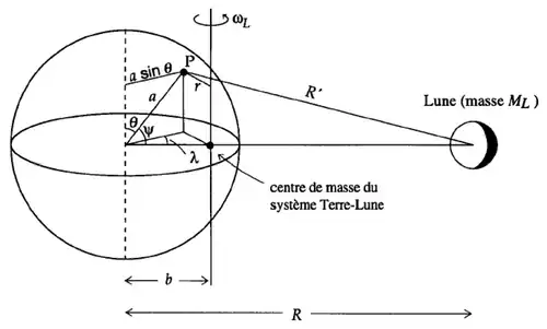 Considérons la géométrie de la figure 2 dans laquelle on a représenté la Terre et la Lune orbitant autour de leur centre de masse commun, lequel se trouve à l'intérieur de la Terre à une distance du centre de masse de la Terre seule. Nous simplifierons la théorie comme il est coutume de le faire[1], en commençant par considérer des marées, ou encore marées d'équilibre. On admet donc que la Terre montre toujours la même face à la Lune, c'est-à-dire qu'elle possède une rotation axiale autant qu'une révolution orbitale à la vitesse angulaire . Ainsi, la figure entière tourne, et le point se trouve à une distance constante de l'axe de rotation.