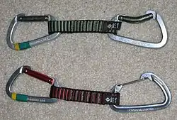 - mousqueton à doigt à fil : ce mousqueton est sensiblement plus léger et offre une résistance similaire à celle d'un mousqueton classique avec un doigt en tube, malgré leur aspect fragile.