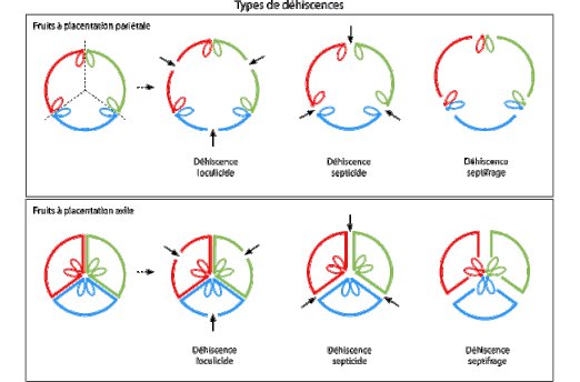- Schizocarpe : La déhiscence peut être Loculicide, Septicide, Septifrage ou Explosive (exemples : Ombellifères, Malvacées, Génariacées).