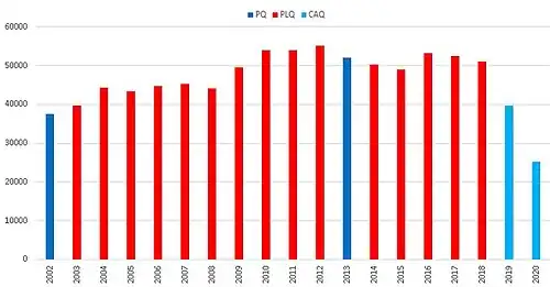 Nombre d'immigrants reçus au Québec selon le gouvernement en place de 2002 à 2020