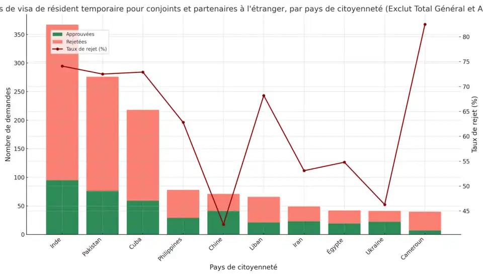Le graphique suivant présente les données sur les demandes de visa de résident temporaire pour les conjoints et partenaires à l'étranger, traitées jusqu'au . Il fournit une répartition par les dix principales nationalités des demandeurs, indiquant le nombre de demandes approuvées et rejetées, ainsi que le taux de rejet correspondant.